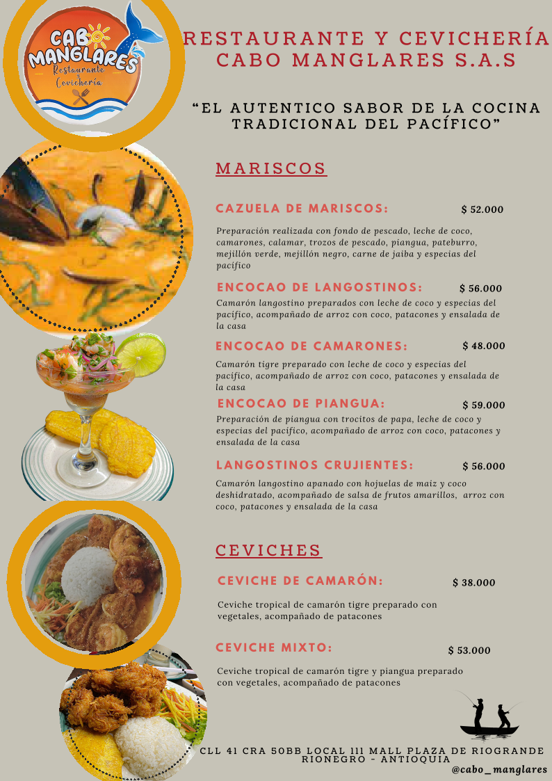 Welcome to Cabo Manglares Restaurante y Cevichería, a delightful gem located in the Mall Plaza de Riogrande, Rionegro, Antioquia. This charming eatery specializes in Pacific Colombian cuisine, offering a taste of the ocean right in the heart of the city. The menu showcases an impressive variety of seafood dishes, making it a paradise for seafood lovers.